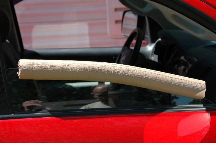 So I thought of using “pipe wrap”, those long closed-cell foam tubes with a slit down one side that is used to help prevent household plumbing pipes from freezing. Well, those sort of worked but the foam is probably less than a half inch thick and it broke down very rapidly. It also could easily fly up off of the window while driving, even at slow speeds. So while it was a good idea, it wasn’t that great.