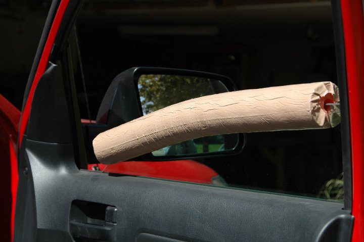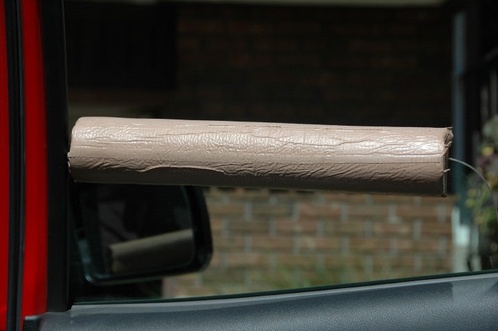 I measured the width of his truck windows then cut a Noodle to those lengths. I used a strip of the Duct Tape to get a straight line down the length of the Noodle then proceeded to using the electric carving knife to cut half way through the Noodle, trying not to cut the opposite side of it where the center hole was. After completing that I placed more strips of Duct Tape to cover up the hideous orange color of the Noodle. I figured something that bright and hideous might scare away the birds or animals. After taping it and leaving an un-taped narrow area where the cut was I took it over and slid it down on the truck window.
