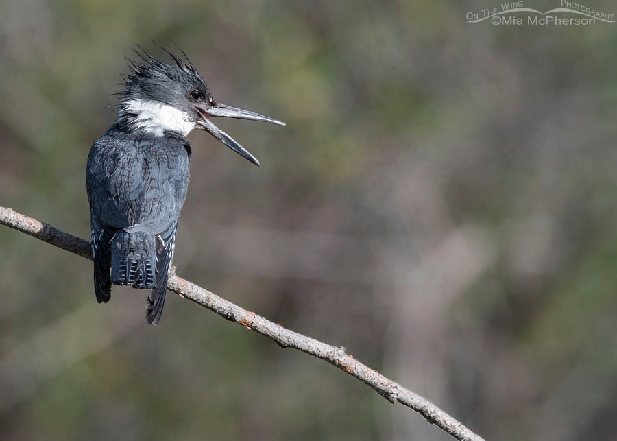 Title: Adult female Belted Kingfisher with her bill open wide