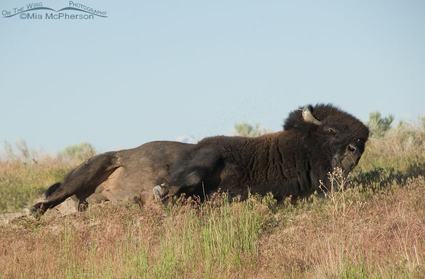 Title: American Bison bull rolling in a dust wallow on Antelope Island