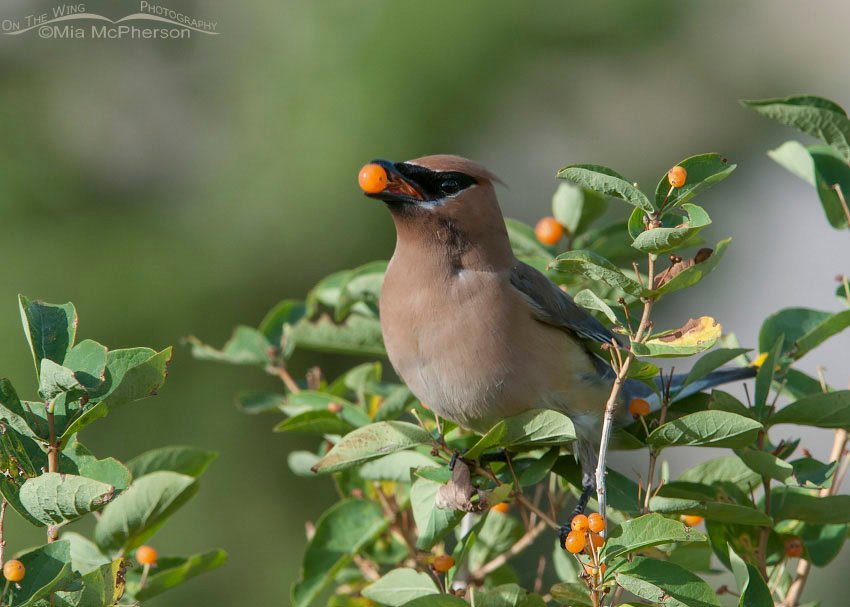 Title: An adult Cedar Waxwing eating a berry