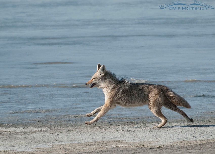 Title: Coyote running like the wind along the causeway