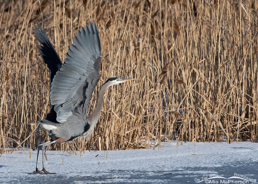 Title: Great Blue Heron lifting off from ice