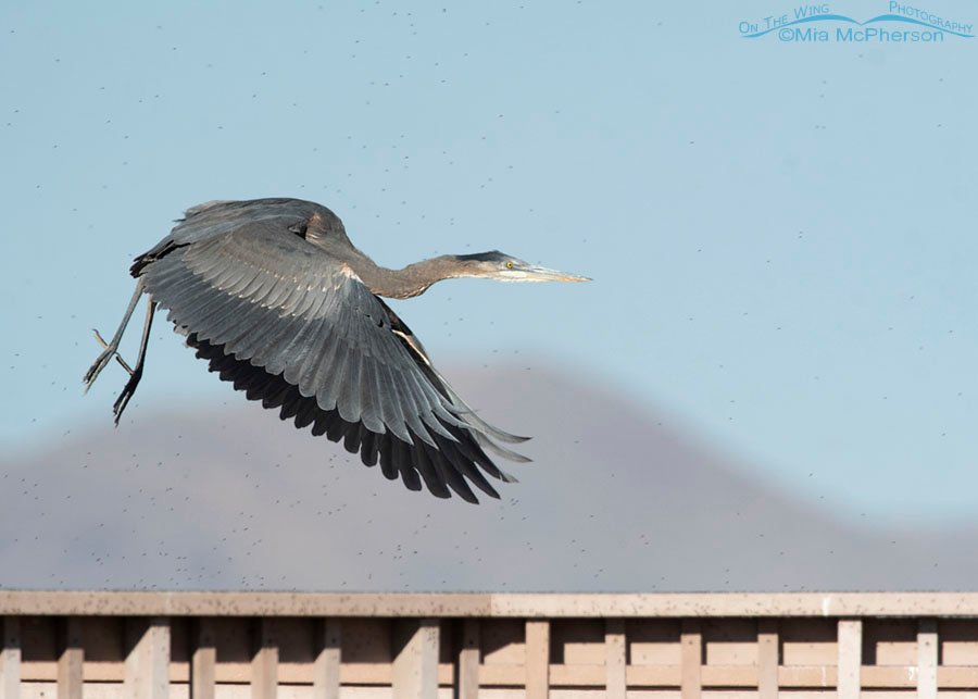 Title: Immature Great Blue Heron in flight right after lift off – Showing the hand of man