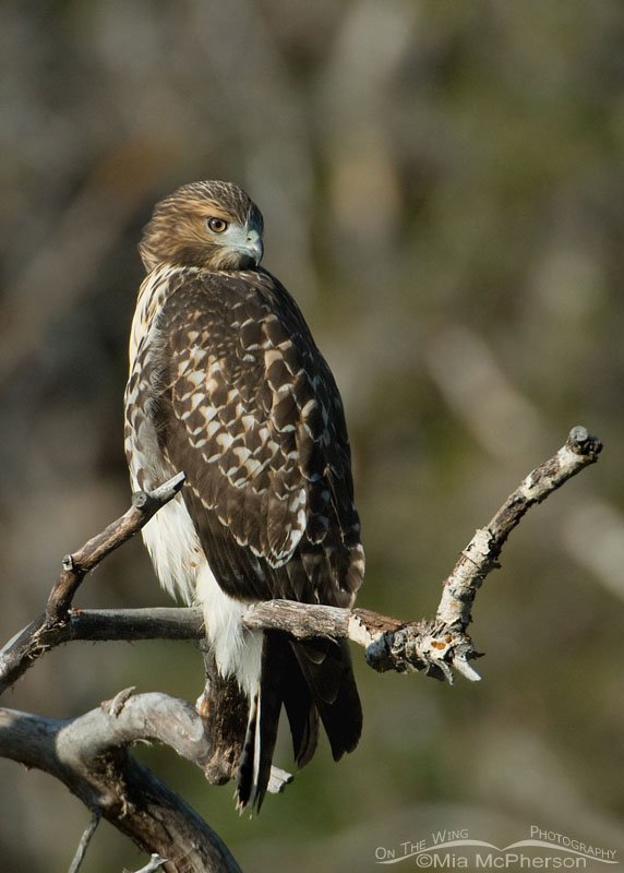 Title: Juvenile Red-tailed Hawk perched on a branch in a canyon