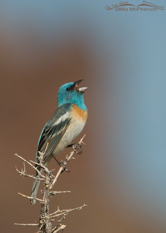 Title: Male Lazuli Bunting singing with canyon walls in the background