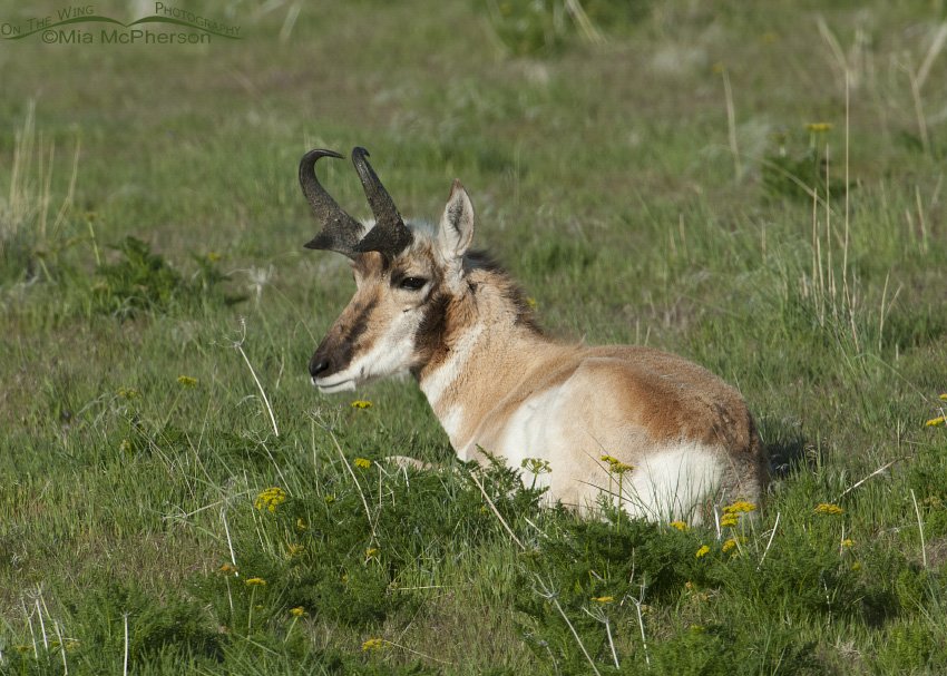 Title: Pronghorn buck resting in Gray’s Biscuitroot and fresh green grasses