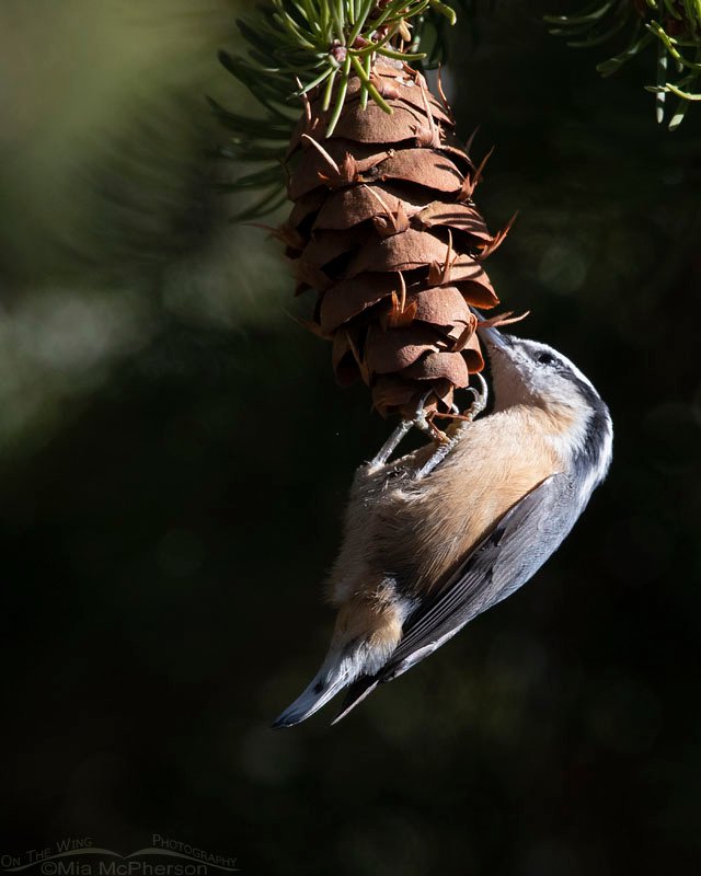 Title: Red-breasted Nuthatch feeding on Douglas Fir cones