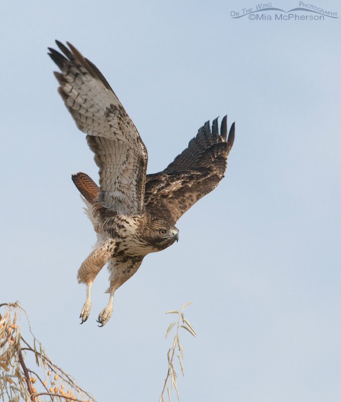 Title: Red-tailed Hawk adult after lifting off from a Russian Olive tree