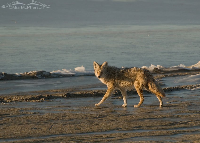 Title: Side lit Coyote on the shoreline of the Great Salt Lake