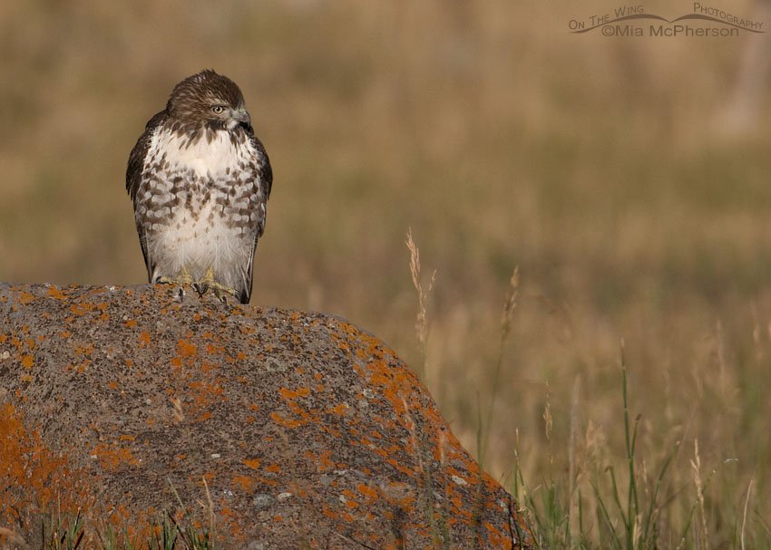 Title: Young Red-tailed Hawk on a lichen covered rock